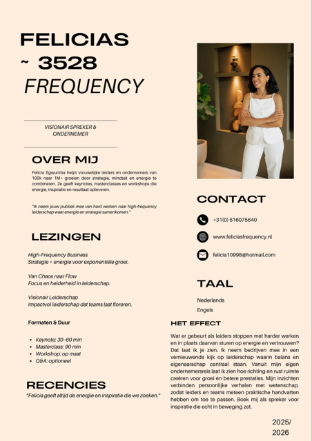 Hi, ik ben Felicia Egwumba, ondernemer, spreker en visionair. Ik help vrouwelijke leiders en ondernemers van 100k naar 1M+ groeien, met een unieke mix van strategie, mindset en energie.Ik neem jouw publiek mee van hard werken naar high-frequency leiderschap, waar energie en strategie samenkomen.”